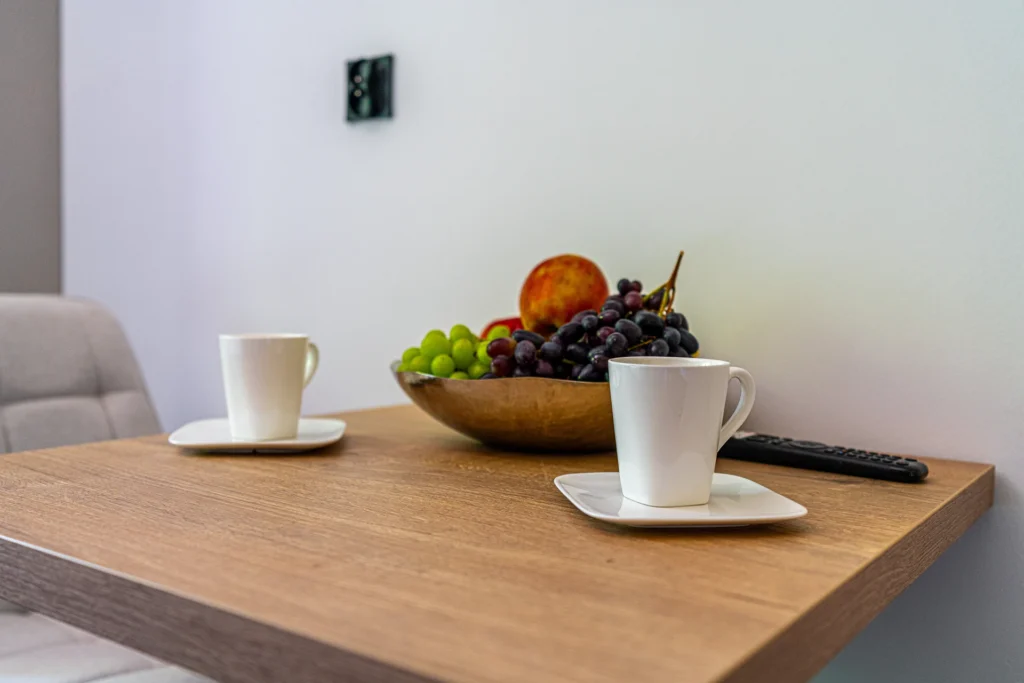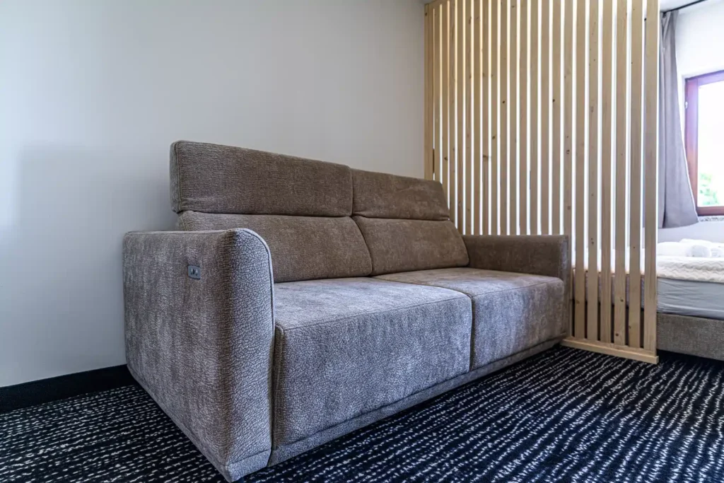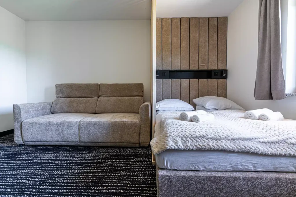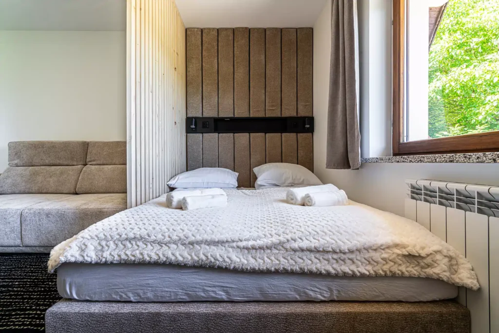 Pokój 4-osobowy, z widokiem na góry. Znajdziesz w nim: wygodne łóżko małżeńskie, rozkładaną sofę, stół z krzesłami, czajnik oraz TV. W łazience: prysznic, mięciutkie ręczniki, kosmetyki oraz suszarka do włosów.